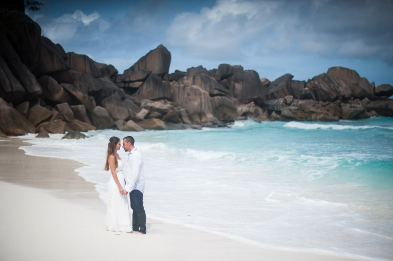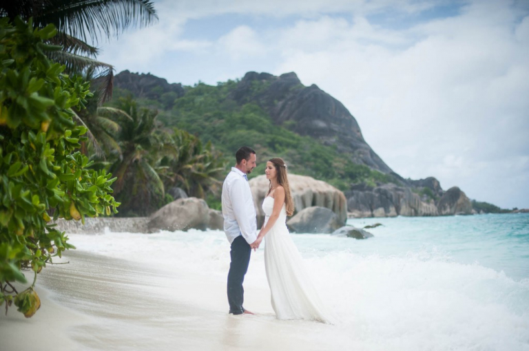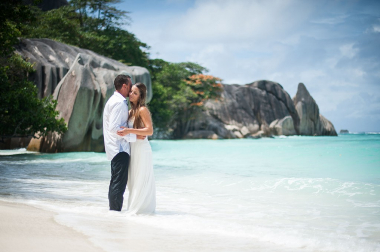 Heiraten auf den Seychellen. Hochzeitsfotos am Strand Grand Anse auf La Digue.