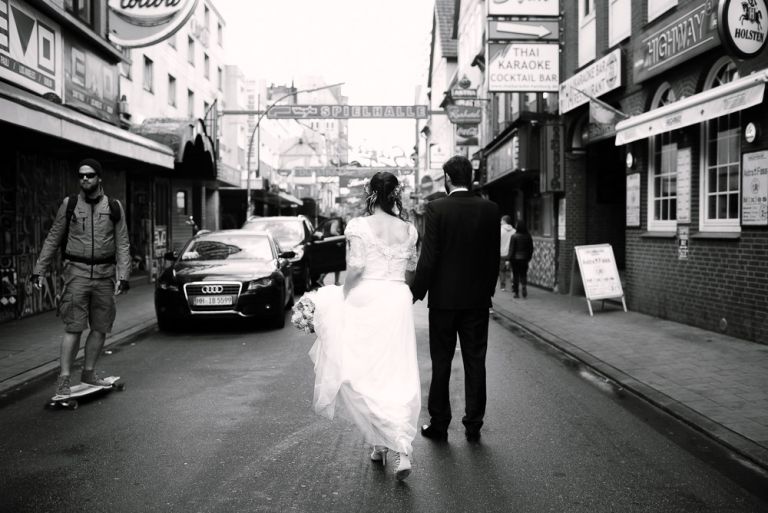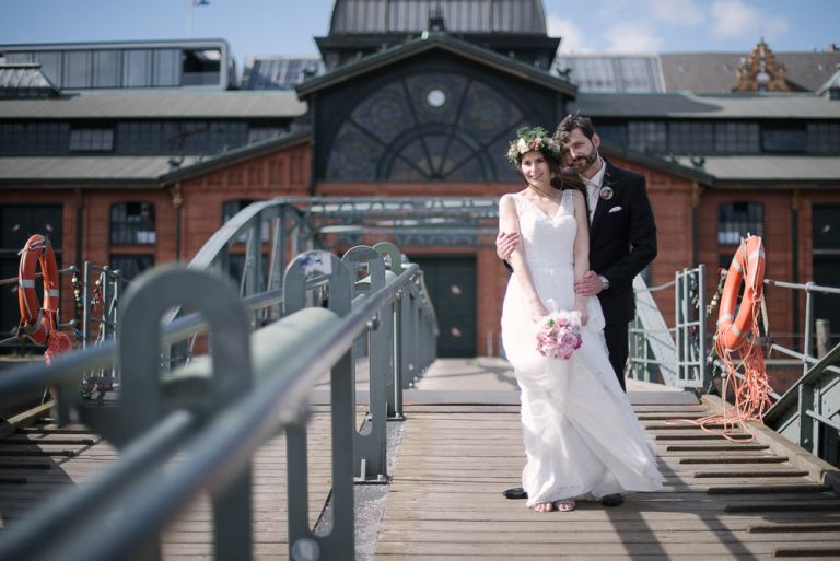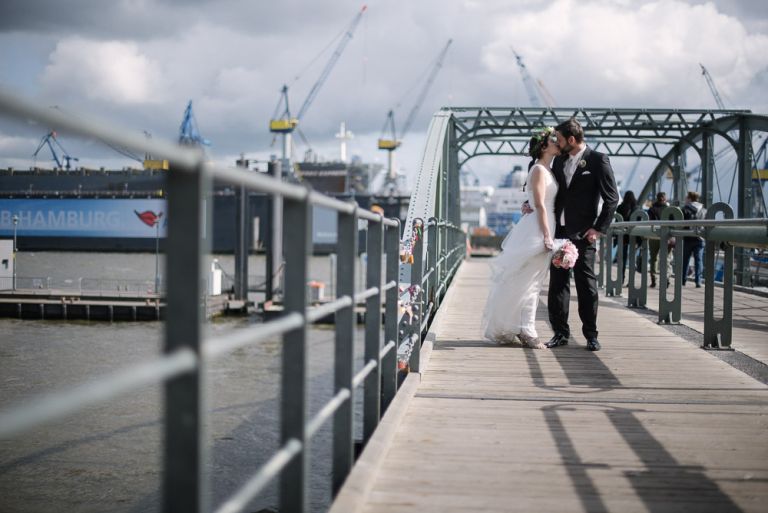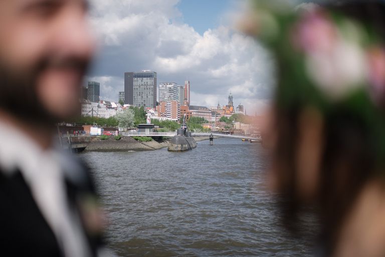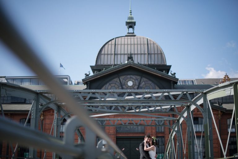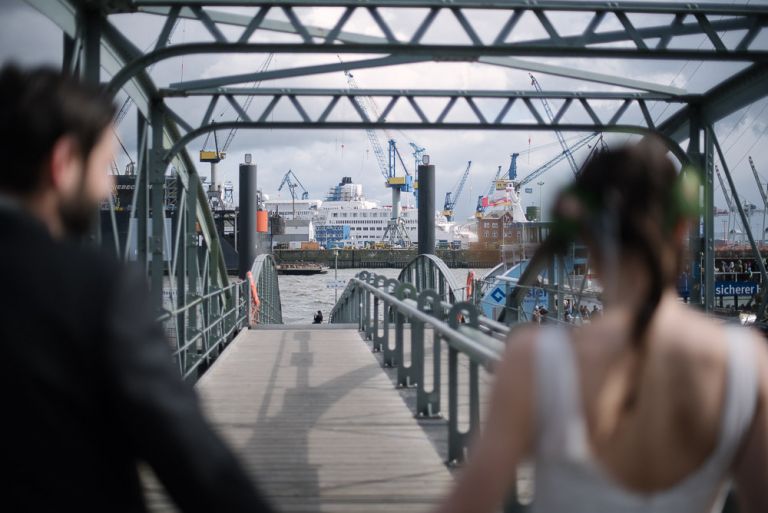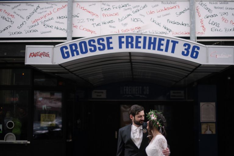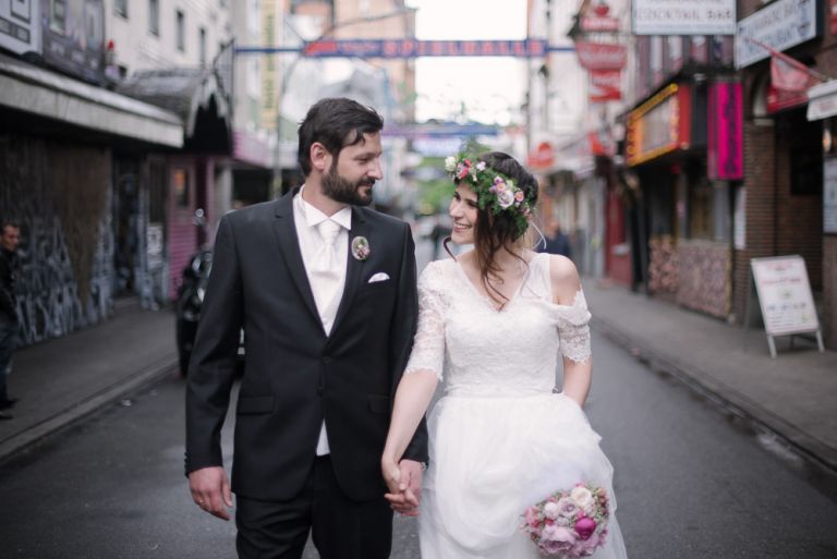 Bei der Vorbereitung unserer Hochzeit war uns klar, dass das Café Kaltehofe die perfekte Location für unsere Feier sein würde. Es verbindet für mich Natur und Industriedenkmal in einem, was dem Ort ein besonderes Flair gibt. Es hat etwas Hanseatisches. Ein Aspekt, der sich wie ein roter Faden durch unsere Hochzeit zog. Wir wollten unbedingt in der St. Joseph Kirche auf der Reeperbahn getraut werden. Es ist Janusz Gemeinde und der Ort ist unbeschreiblich schön. Und der Kiez – Hamburgischer geht es kaum. Es war, denke ich, einer der emotionalsten Momente, vorne beim Altar zu stehen. Dieser Moment als der Pfarrer uns das Band um die Hände legte.