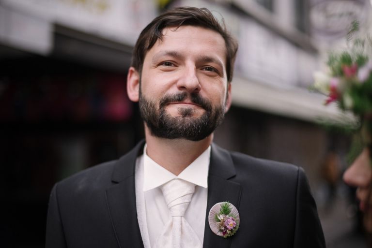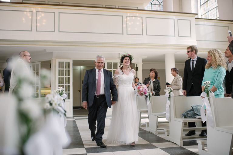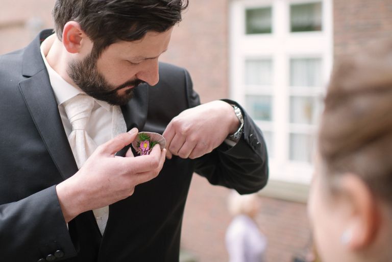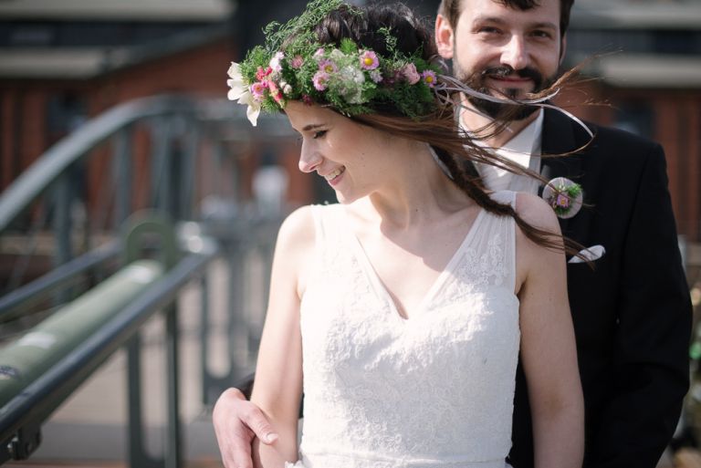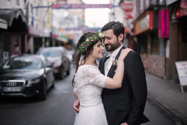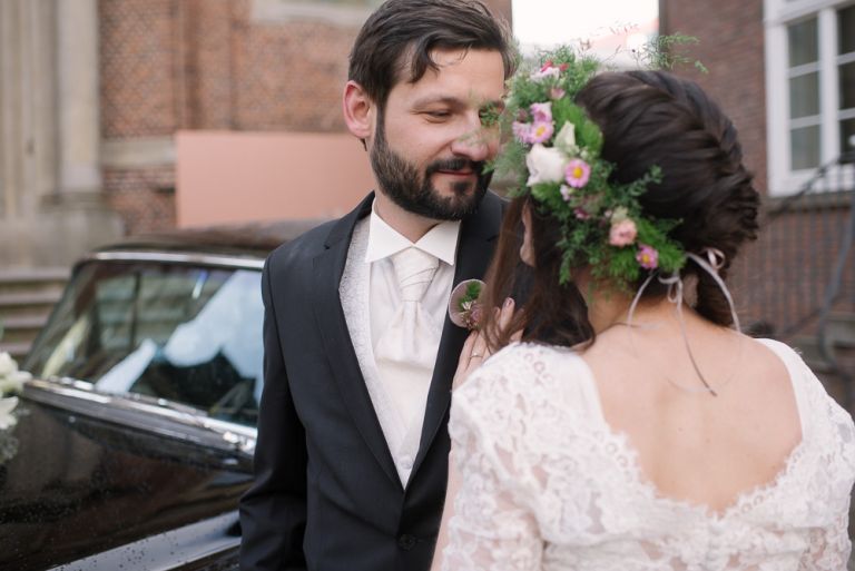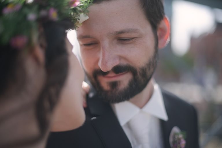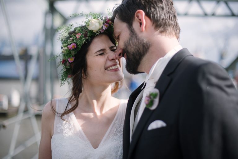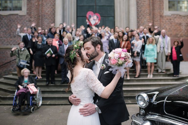 Bei der Vorbereitung unserer Hochzeit war uns klar, dass das Café Kaltehofe die perfekte Location für unsere Feier sein würde. Es verbindet für mich Natur und Industriedenkmal in einem, was dem Ort ein besonderes Flair gibt. Es hat etwas Hanseatisches. Ein Aspekt, der sich wie ein roter Faden durch unsere Hochzeit zog. Wir wollten unbedingt in der St. Joseph Kirche auf der Reeperbahn getraut werden. Es ist Janusz Gemeinde und der Ort ist unbeschreiblich schön. Und der Kiez – Hamburgischer geht es kaum. Es war, denke ich, einer der emotionalsten Momente, vorne beim Altar zu stehen. Dieser Moment als der Pfarrer uns das Band um die Hände legte.