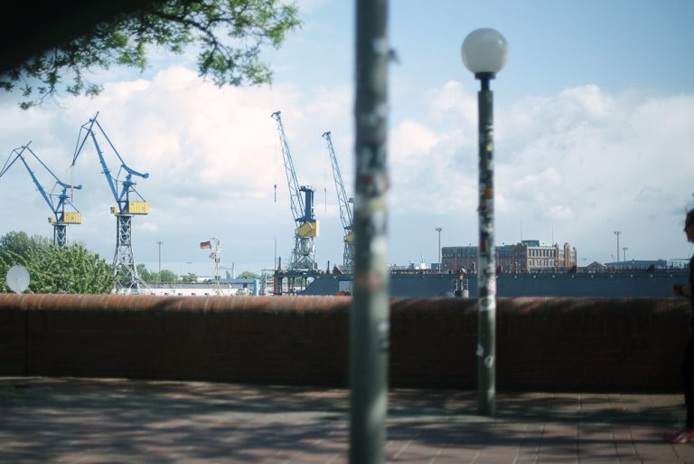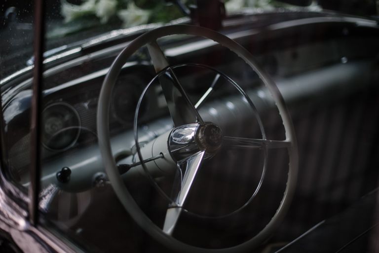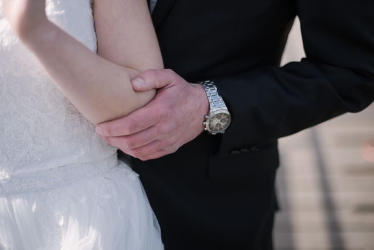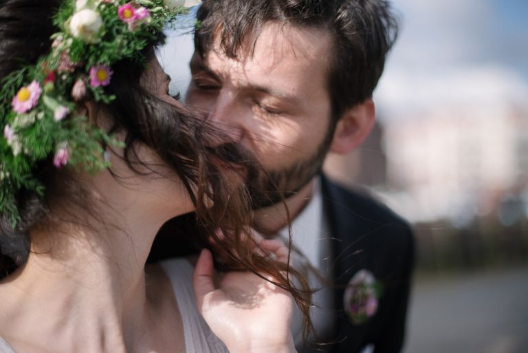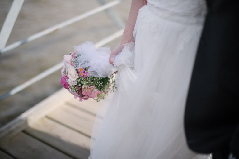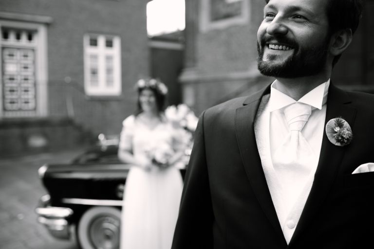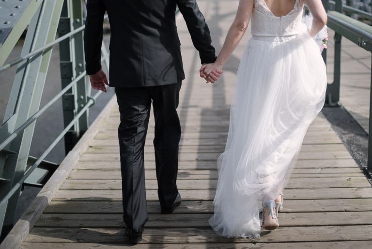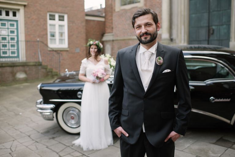 Als wir die Kirche verließen, regnete es. Angeblich soll das ja ein gutes Zeichen für die Ehe sein. Eigentlich war es mir nicht so wichtig, wie wir von der Kirche zur Feier kommen. Der Buick lag eher Janusz am Herzen, aber als wir dann in dem Auto saßen, war es schon ein besonderes Gefühl. Auf dem Weg zum Hafen hatten wir noch mal einen Moment für uns. Die Fotos dort zu machen, war Stefans Idee und eher eine spontane Aktion. Die dort entstandenen Bilder gehören aber definitiv mit zu meinen Lieblingsfotos.